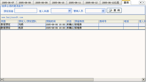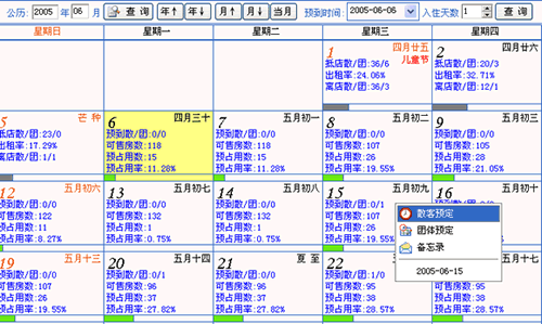 举例:例如要做一个2005.06.15号的预定单,那么就把鼠标移到酒店日历 06.15号上